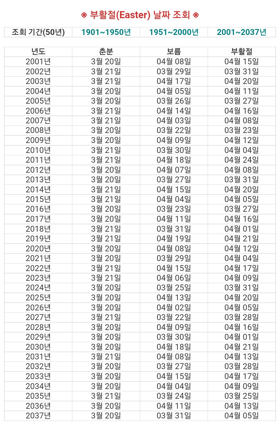 즉, 매년 춘분은 양력 3월 20일~21일이니 춘분이 지난 후 첫 보름(15일) 다음에 오는 첫번째 일요일이 부활절입니다.