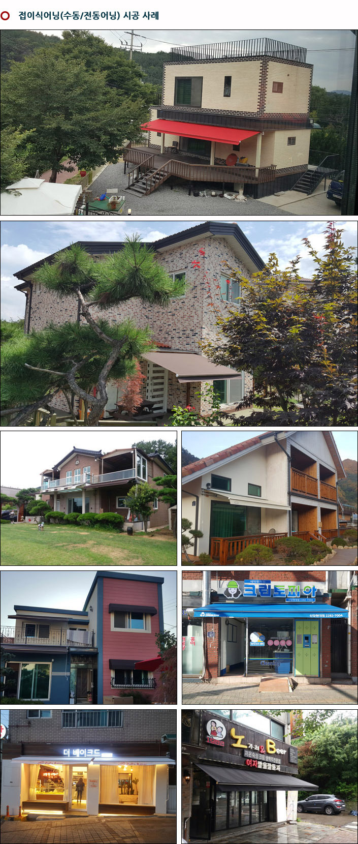 접이식어닝 (수동어닝,전동어닝) / 프라자어닝 / 간판대용 고정어닝 / 아스테이지(방풍막 비닐) / 렉산시공 및 방부목 데크설치(옥상.발코니.테라스.출입문) / 천막 생산 제작 및 시공하는 전문업체입니다. (프라자어닝:벽이 없거나 낮은 경우 구조물 설치 | 전동어닝:스위치방식,리모컨방식 | 아스테이지:겨울 추위 방풍비닐등)