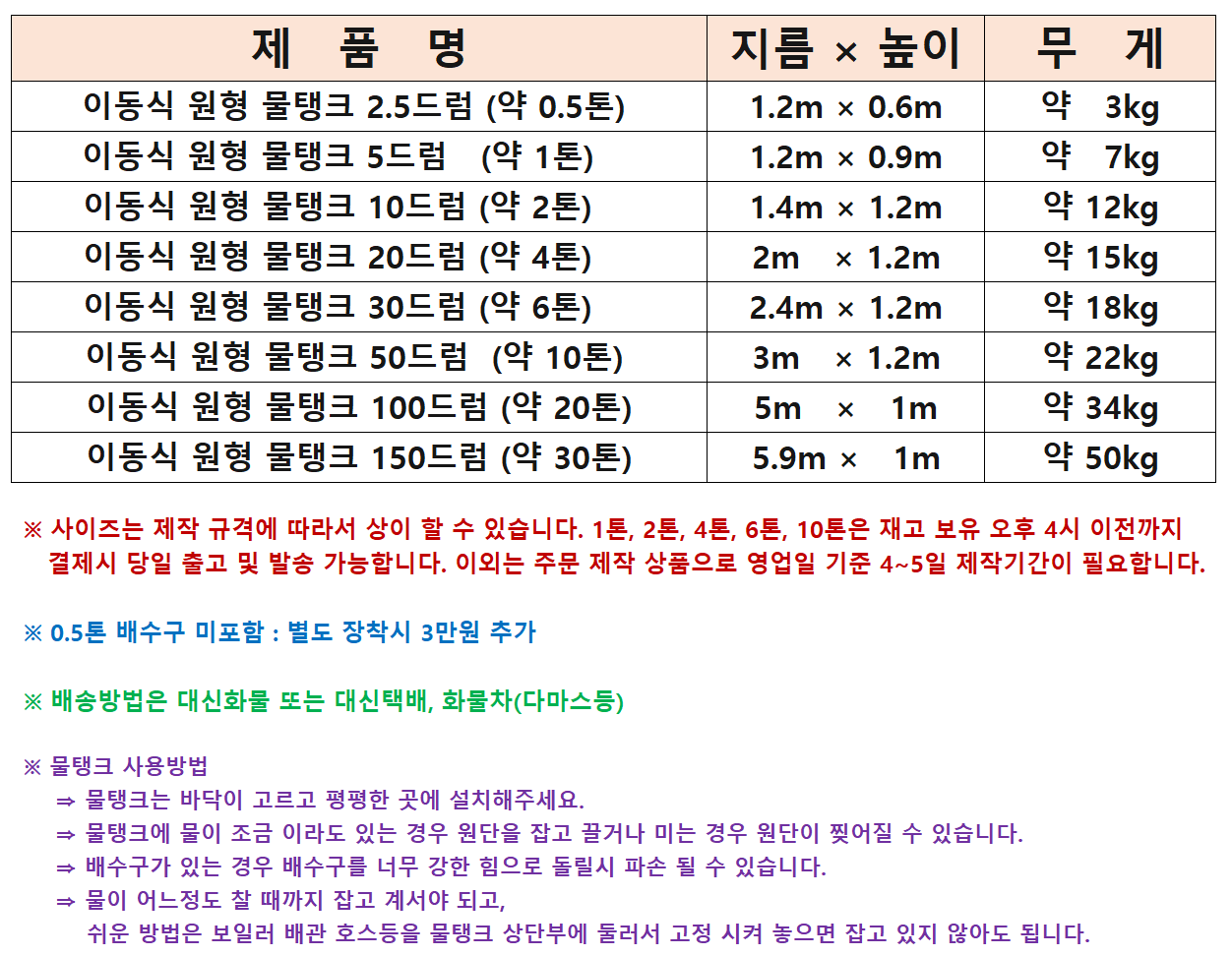 이동식 물탱크 2.5드럼(0.5톤/500리터/배수구 미포함) / 5드럼(1톤) / 10드럼(2톤) / 20드럼(4톤) / 30드럼(6톤) / 50드럼(10톤) / 100드럼(20톤) 수영장 사용시 어린이 20~30명용/ 150드럼(30톤) 수영장 사용시 어린이 30~40명용