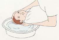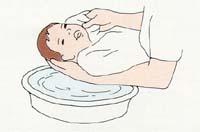 2. 옷을 입은 다음 머리를 씻기는데 왼쪽 엄지손가락과 셋째 손가략으로 양귀를 막습니다. 비누거품을 내어 오른쪽 손바닥으로 머리를 문지르듯이 씻고 세면기에 담아둔 더운 물로 헹굽니다. 아기의 두피는 연약하므로 너무 박박 문지르면 안됩니다.