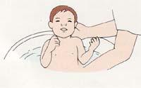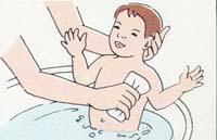 4. 아기 옷을 벗긴 후 아기를 목욕통에 담그고 비누칠 하여 가슴, 겨드랑이, 팔, 손, 사타구니, 다리, 발을 깨끗이 씻깁니다. 절대로 얼굴과 귀를 물속에 완전히 담궈서는 안됩니다.
